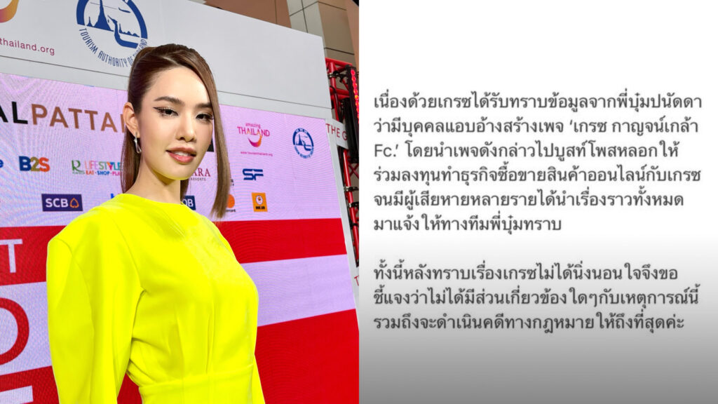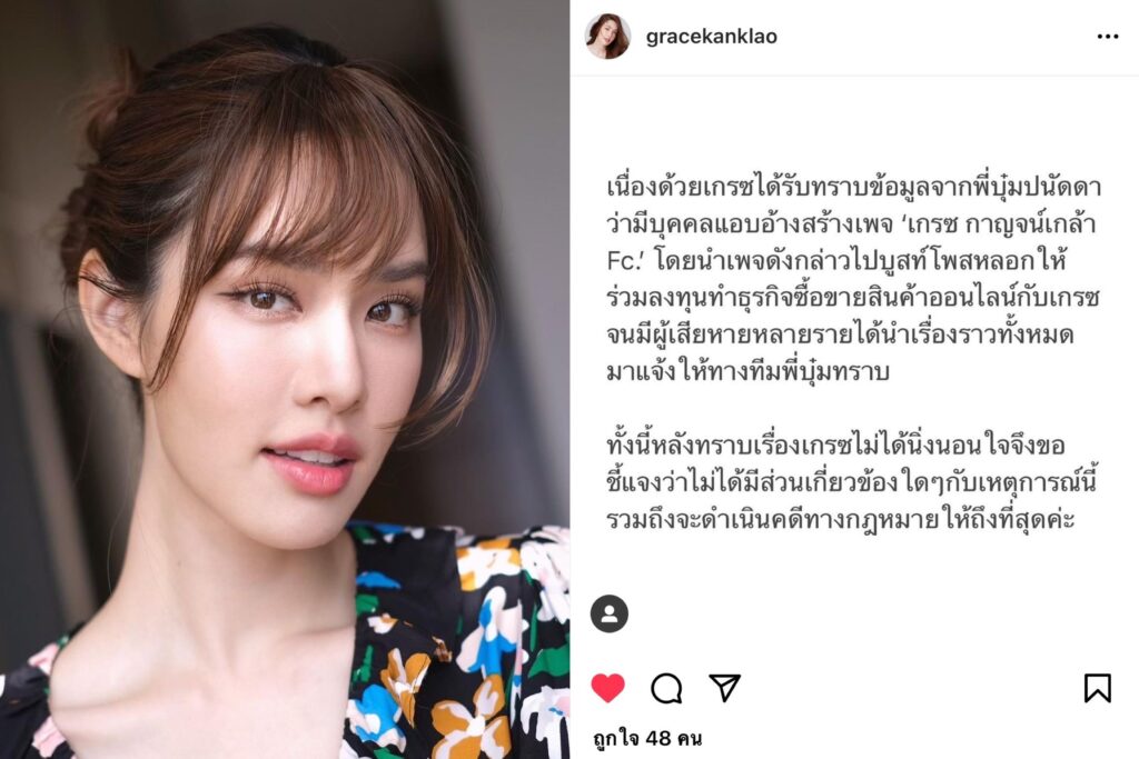 ไม่นิ่งนอนใจ “เกรซ กาญจน์เกล้า” แจงหลังมีเพจอ้างชื่อหลอกคนลงทุน ลั่นเอาเรื่องถึงที่สุด