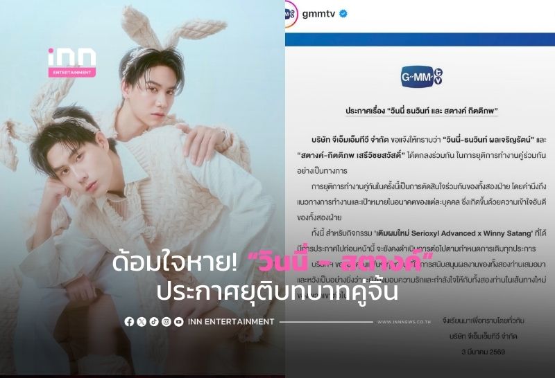 ด้อมใจหาย! “วินนี่ – สตางค์” ประกาศยุติบทบาทคู่จิ้น