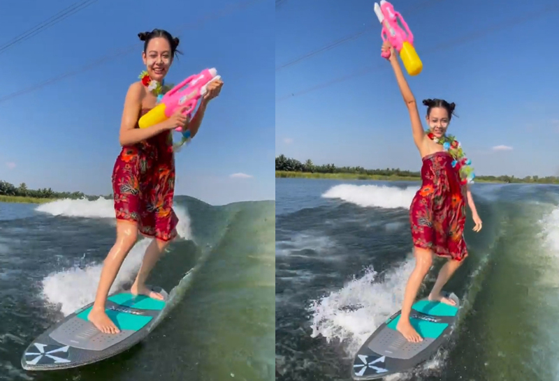 ไม่ตกเทรนด์! “แซมมี่” ต้อนรับสงกรานต์ นุ่งกระโจมอกถือปืนฉีดน้ำเล่นเซิร์ฟ