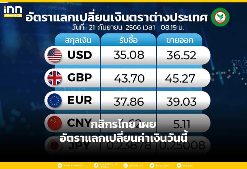 อัตราแลกเปลี่ยนเงินตราต่างประเทศ ของธนาคารกสิกรไทย เวลา 08.19 น. ดอลลาร์สหรัฐ รับซื้อ 35.08 บาท ขายออก 36.52 บาท