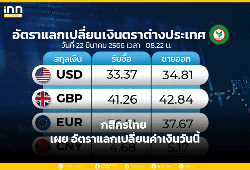 อัตราแลกเปลี่ยนเงินตราต่างประเทศ ของธนาคารกสิกรไทย เวลา 08.22 น. ดอลลาร์สหรัฐ รับซื้อ 33.37 บาท ขายออก 34.81 บาท