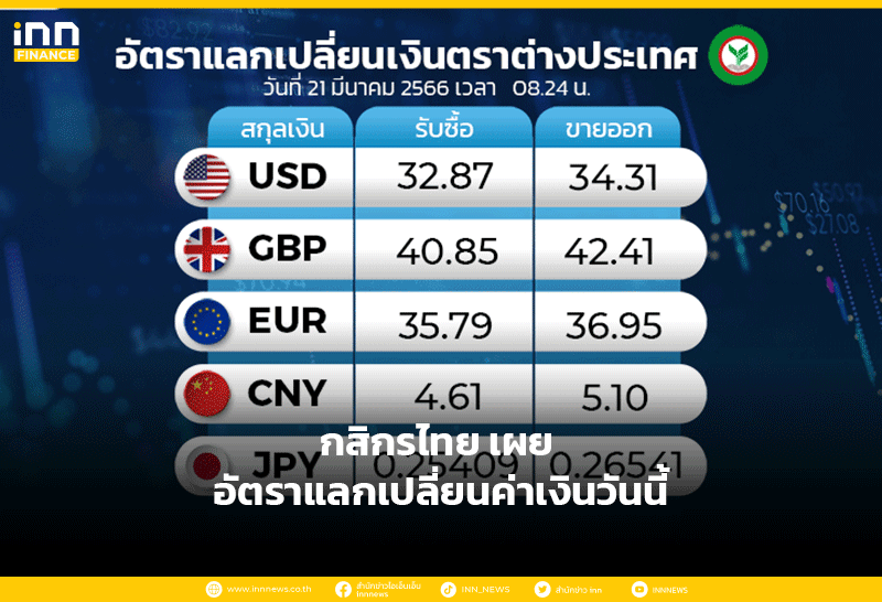 อัตราแลกเปลี่ยนเงินตราต่างประเทศ ของธนาคารกสิกรไทย เวลา 08.24 น. ดอลลาร์สหรัฐ รับซื้อ 32.87 บาท ขายออก 34.31 บาท