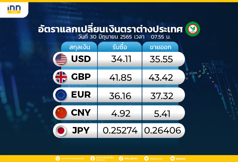 อัตราแลกเปลี่ยนเงินตราต่างประเทศ ของธนาคารกสิกรไทย เวลา 07.55 น. ดอลลาร์สหรัฐ รับซื้อ 34.11 บาท ขายออก 35.55 บาท