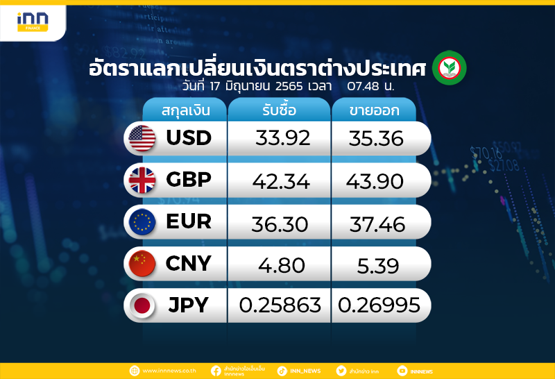 อัตราแลกเปลี่ยนเงินตราต่างประเทศของธนาคารกสิกรไทย เวลา 07.55 น. ดอลลาร์สหรัฐ รับซื้อ 34.10 บาท ขายออก 35.54 บาท