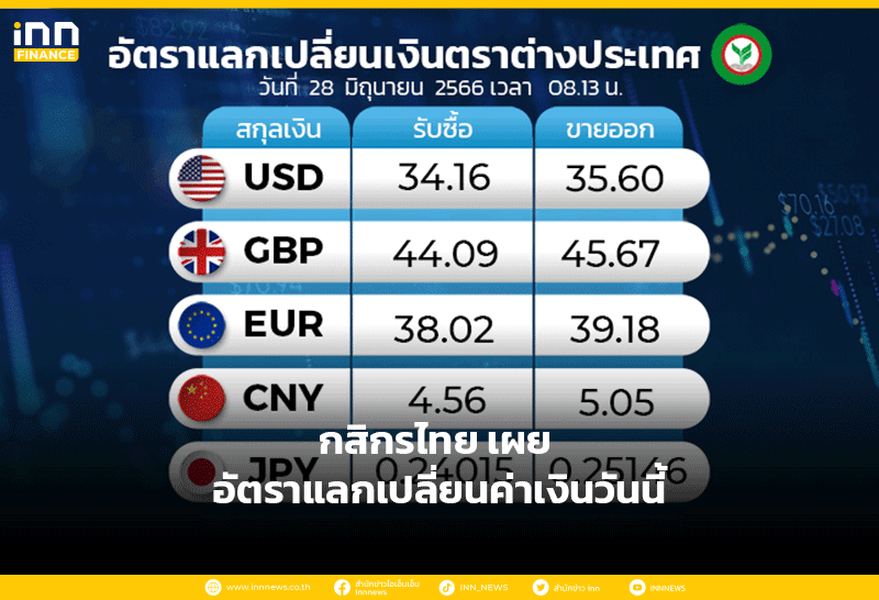 อัตราแลกเปลี่ยนเงินตราต่างประเทศ ของธนาคารกสิกรไทย เวลา 08.13 น. ดอลลาร์สหรัฐ รับซื้อ 34.16 บาท ขายออก 35.60 บาท