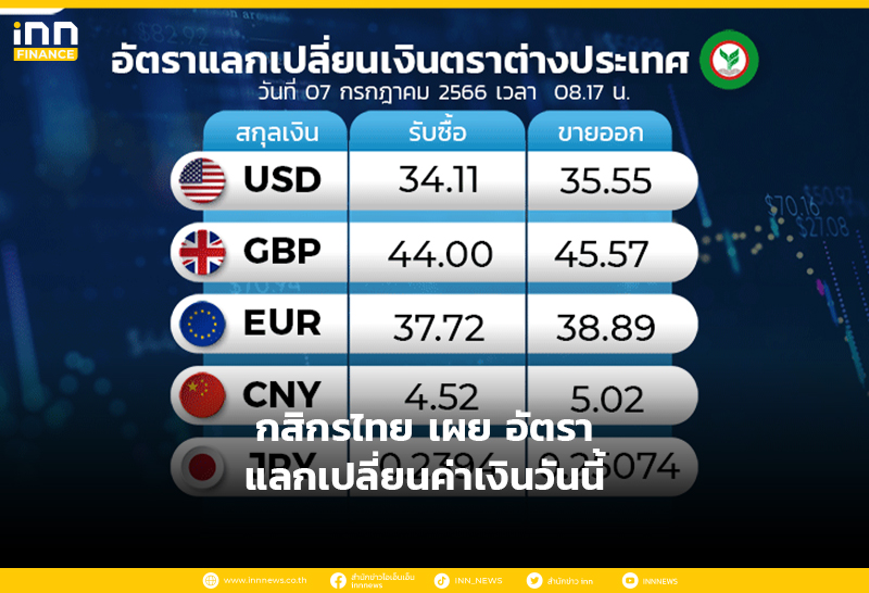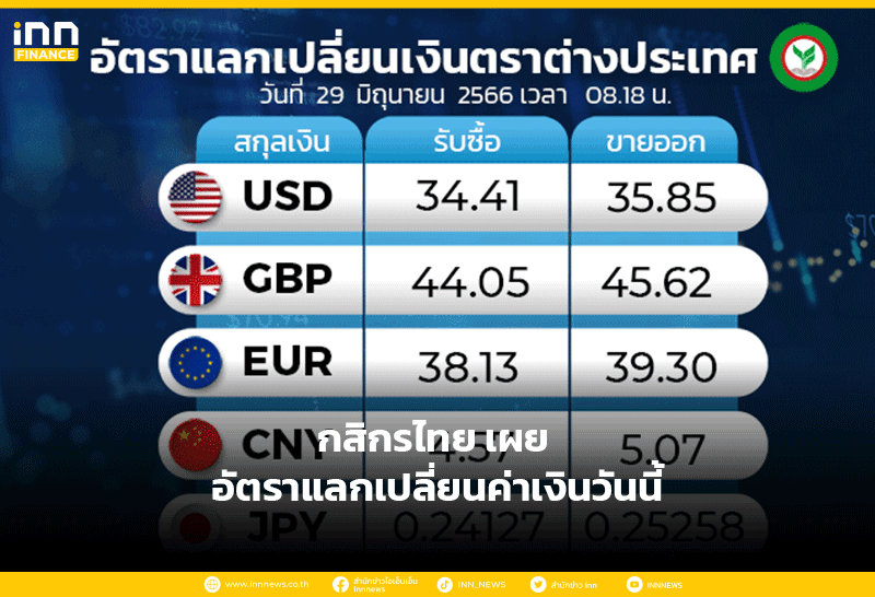 อัตราแลกเปลี่ยนเงินตราต่างประเทศ ของธนาคารกสิกรไทย เวลา 08.17 น. ดอลลาร์สหรัฐ รับซื้อ 34.11 บาท ขายออก 35.55 บาท