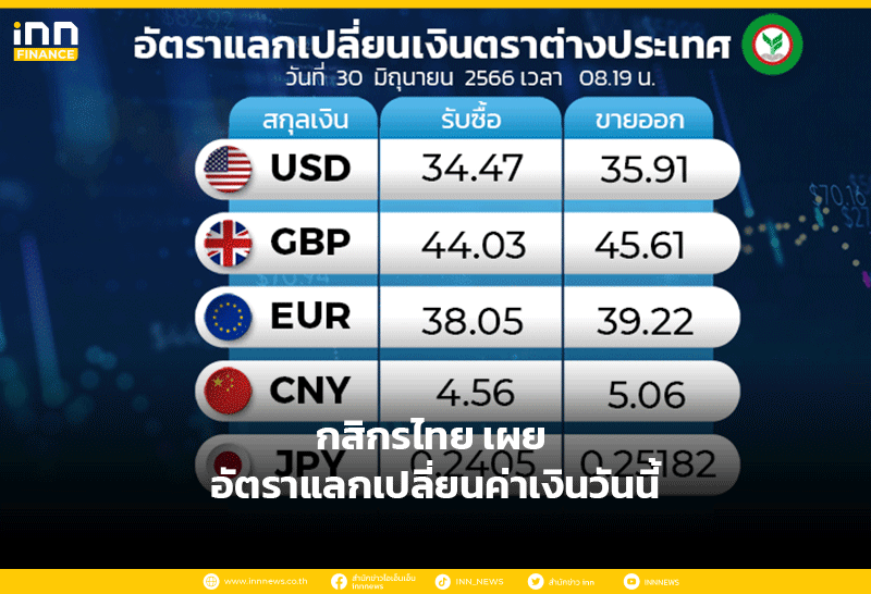 อัตราแลกเปลี่ยนเงินตราต่างประเทศ ของธนาคารกสิกรไทย เวลา 08.19 น. ดอลลาร์สหรัฐ รับซื้อ 34.47 บาท ขายออก 35.91 บาท