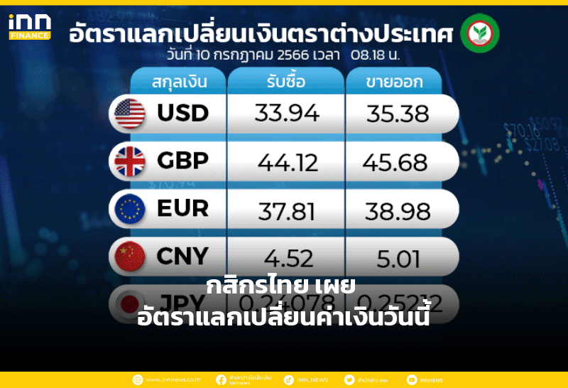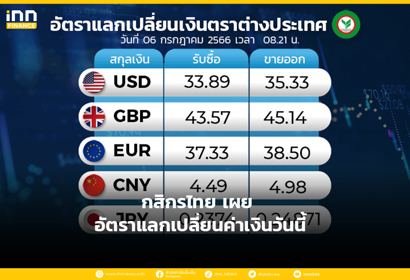 อัตราแลกเปลี่ยนเงินตราต่างประเทศ ของธนาคารกสิกรไทย เวลา 08.18 น. ดอลลาร์สหรัฐ รับซื้อ 33.94 บาท ขายออก 35.38 บาท