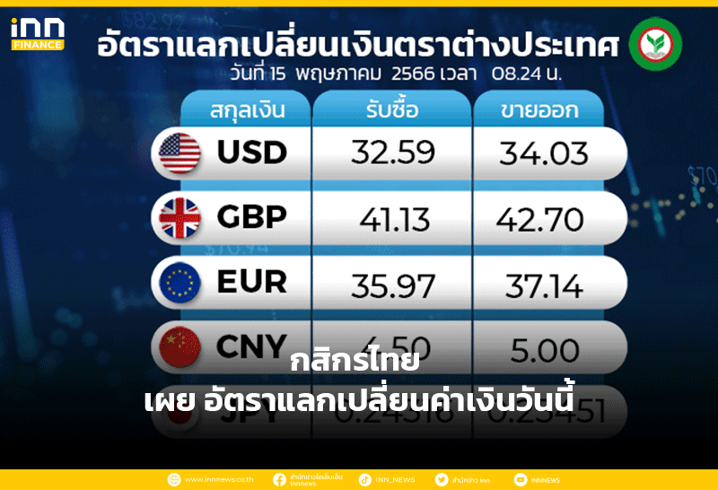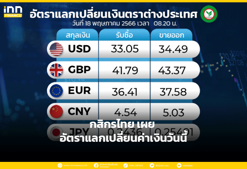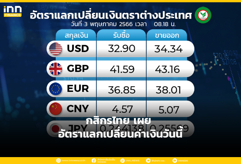 อัตราแลกเปลี่ยนเงินตราต่างประเทศ ของธนาคารกสิกรไทย เวลา 0820 น. ดอลลาร์สหรัฐ รับซื้อ 33.05 บาท ขายออก 34.49 บาท