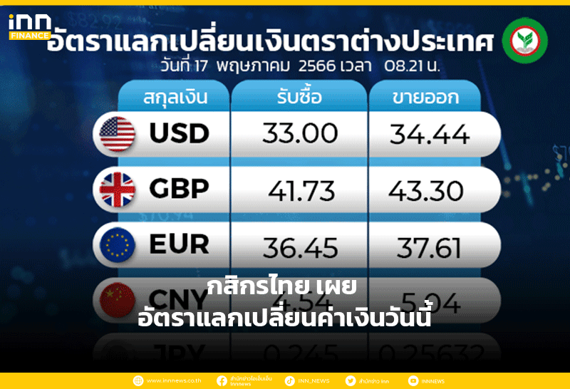 อัตราแลกเปลี่ยนเงินตราต่างประเทศ ของธนาคารกสิกรไทย เวลา 08.21 น. ดอลลาร์สหรัฐ รับซื้อ 33.00 บาท ขายออก 34.44 บาท