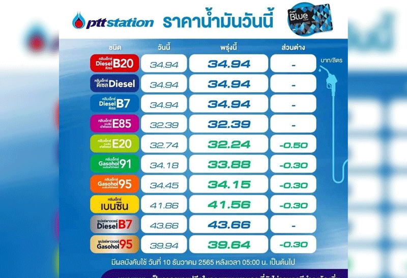ปตท. บางจาก ลดราคาขายปลีกน้ำมันกลุ่มเบนซินและแก๊สโซฮอล์ทุกชนิด 30 ส.ต./ลิตร เว้น E20 ลง 50 ส.ต./ลิตร ส่วน E85 และ กลุ่มดีเซลคงเดิมมีผล 10 ธ.ค.