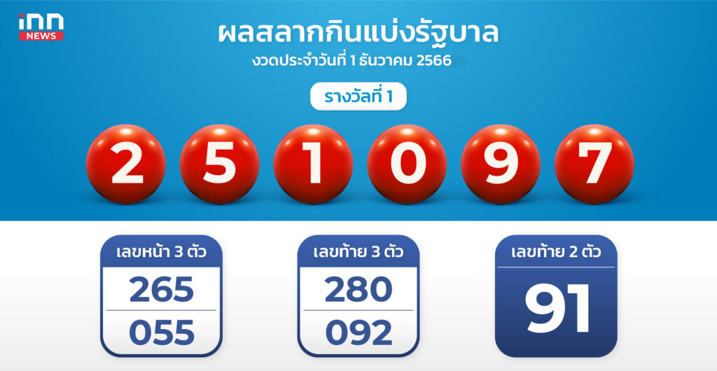 ผลสลากงวด 1 ธ.ค. 66 รางวัลที่ 1 คือ 251097 สองตัว 91