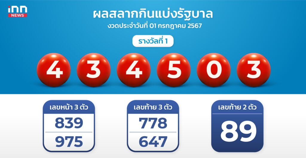 ผลสลากงวด 1 กรกฎาคม 67 รางวัลที่ 1 คือ 434503 สองตัว 89