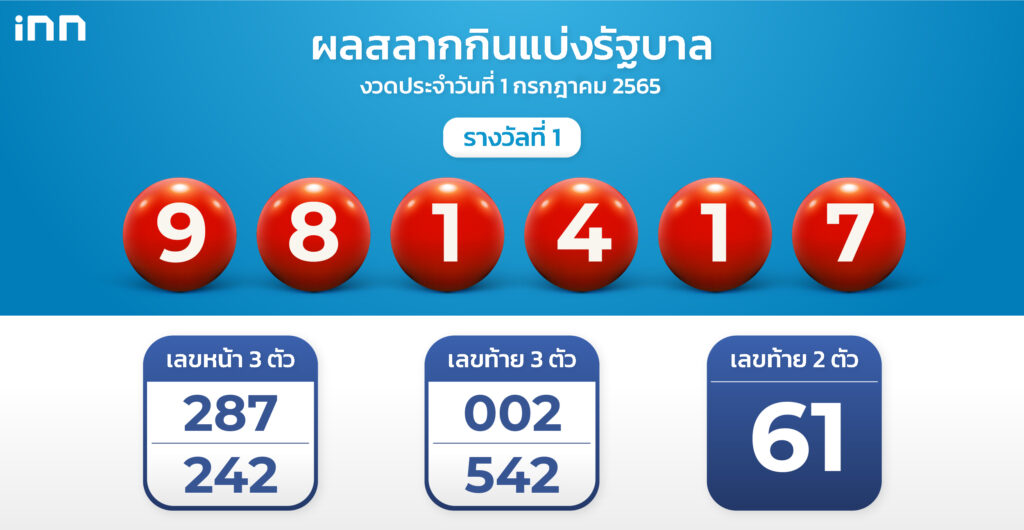 ผลสลากงวด 1 ก.ค. 65 รางวัลที่ 1 คือ 981417 สองตัว 61