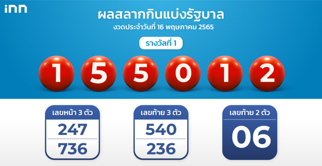 ผลสลากงวด 16 พ.ค. 65 รางวัลที่ 1 คือ 155012 สองตัว 06