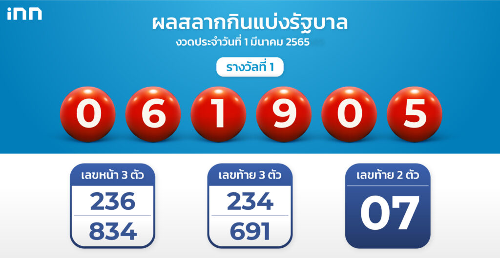 ผลสลากงวด 1 มี.ค. 65 รางวัลที่ 1 คือ 061905 สองตัว 07