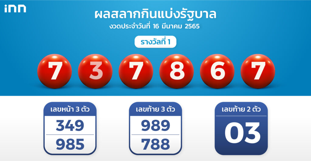 ผลสลากงวด 16 มี.ค. 65 รางวัลที่ 1 คือ 737867 สองตัว 03