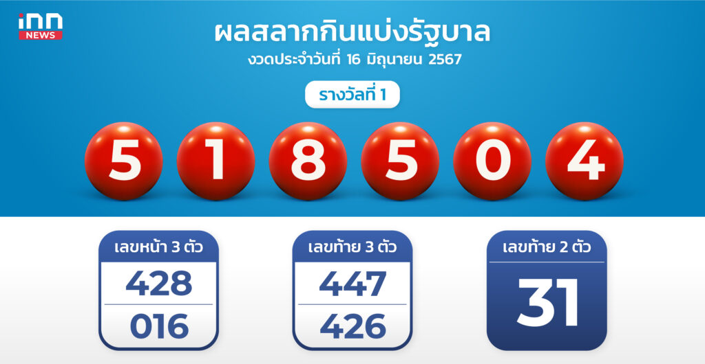 ผลสลากงวด 16 มิถุนายน 67 รางวัลที่ 1 คือ 518504 สองตัว 31