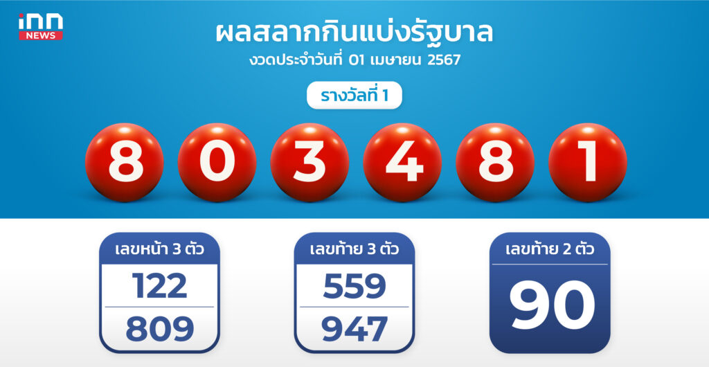 ผลการออกรางวัล สลากกินแบ่งรัฐบาล งวดประจำวันที่ 1 เมษายน 2567 คือ 803481