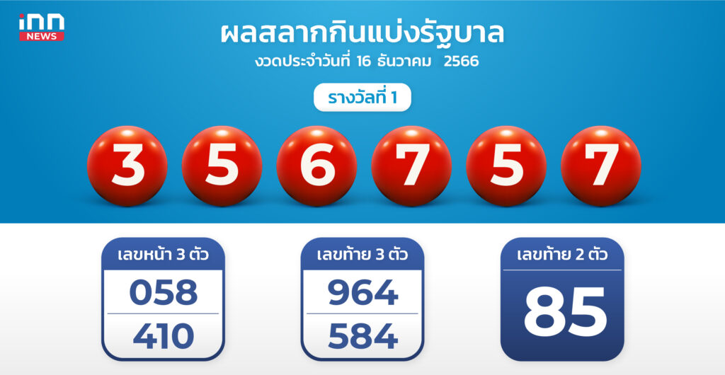 ผลสลากงวด 16 ธ.ค. 66 รางวัลที่ 1 356757 คือสองตัว 85