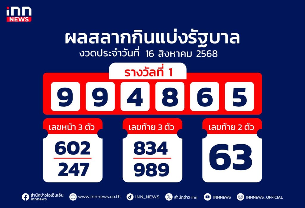 ผลสลากงวด 16 สิงหาคม 68 รางวัลที่ 1 คือ 994865 สองตัว 63