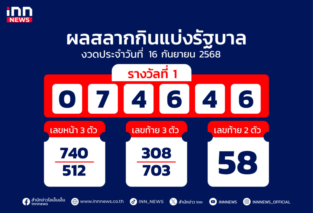 ผลสลากงวด 16 กันยายน 68 รางวัลที่ 1 คือ 074646 สองตัว 58