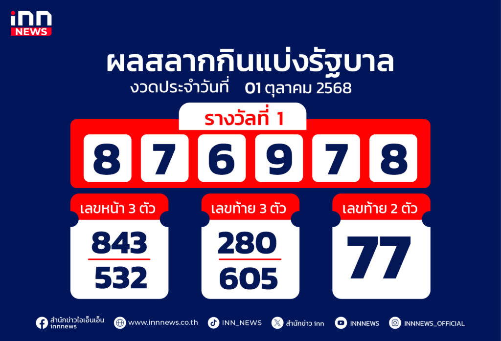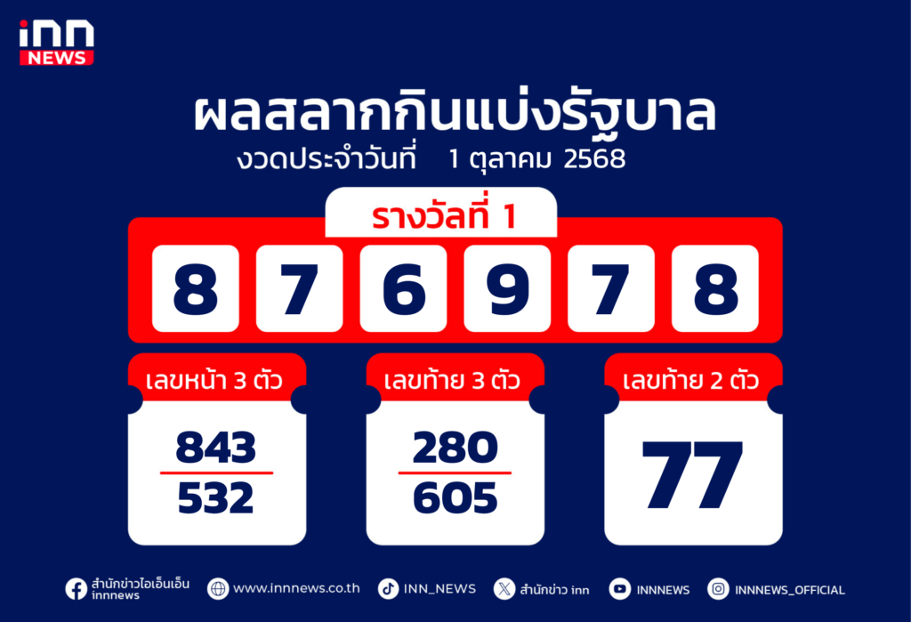 ผลสลากงวด 1 ตุลาคม 68 รางวัลที่ 1 คือ 876978 สองตัว 77