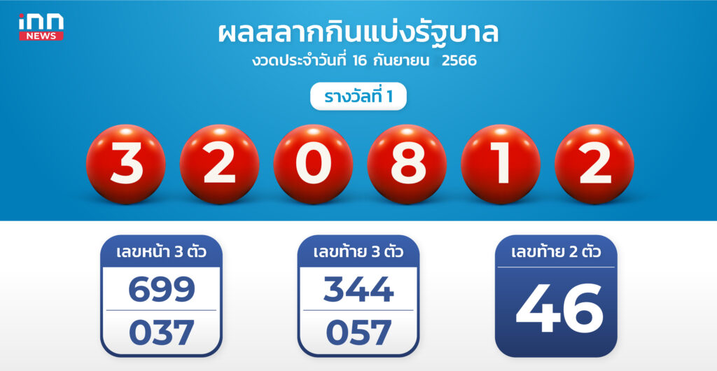 ผลสลากงวด 16 ก.ย. 66 รางวัลที่ 1 คือ 320812 สองตัว 46