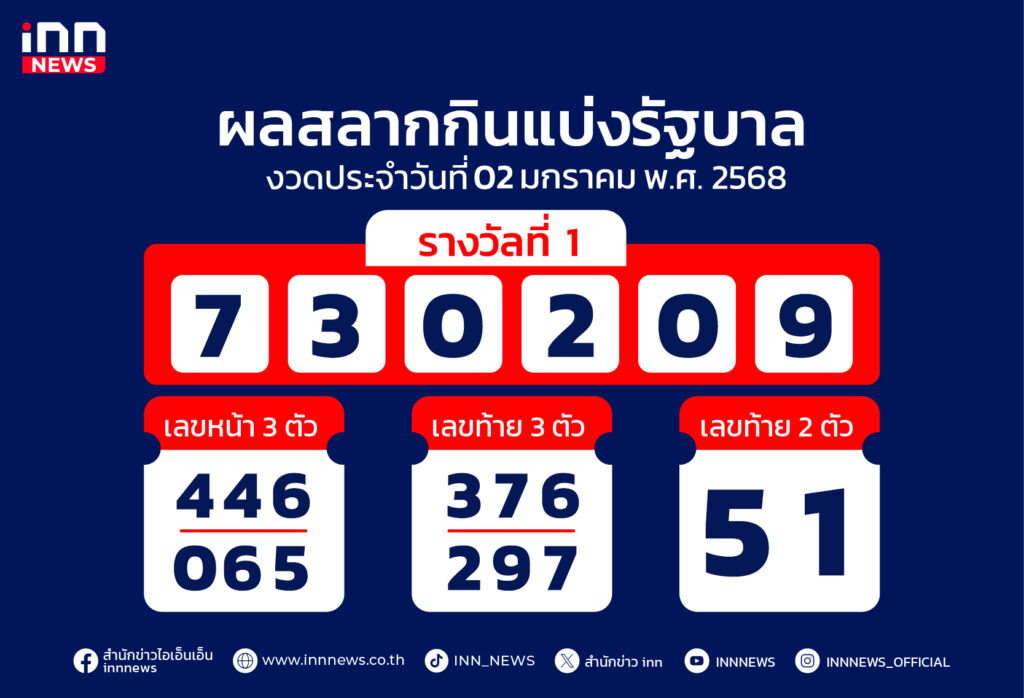 ผลสลากงวด 02 มกราคม 2568 รางวัลที่ 1 คือ 730209 สองตัว 51