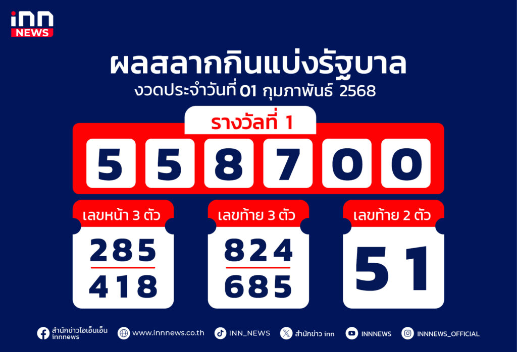 ผลสลากงวด 01 กุมภาพันธ์ 68 รางวัลที่ 1 คือ 558700 สองตัว 51