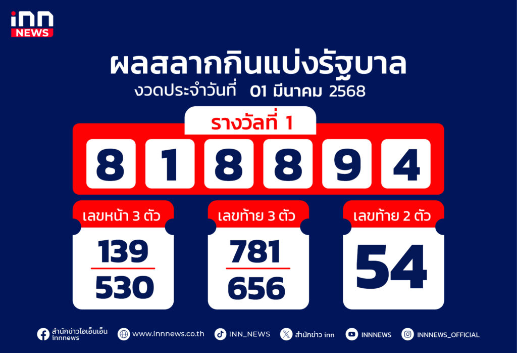 ผลสลากงวด 1 มีนาคม 68 รางวัลที่ 1 คือ 818894 สองตัว 54