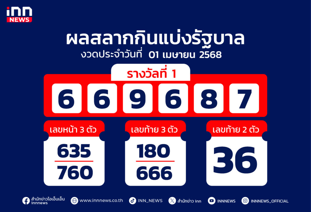 ผลสลากงวด 1 เมษายน 2568 รางวัลที่ 1 คือ 669687 สองตัว 36