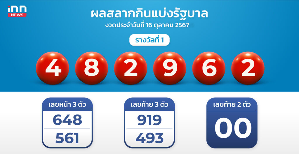 ผลสลากงวด 16 ตุลาคม 67 รางวัลที่ 1 คือ 482962 สองตัว 00