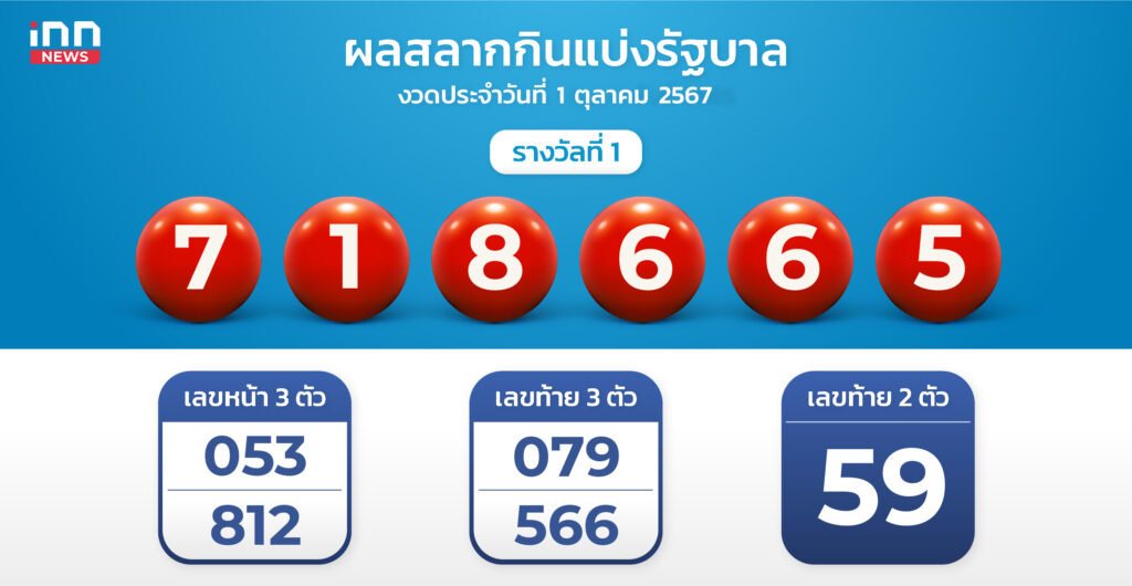 ผลการออกรางวัล สลากกินแบ่งรัฐบาล งวดประจำวันที่ 1 ตุลาคม 67 คือ 718665 สองตัว 59