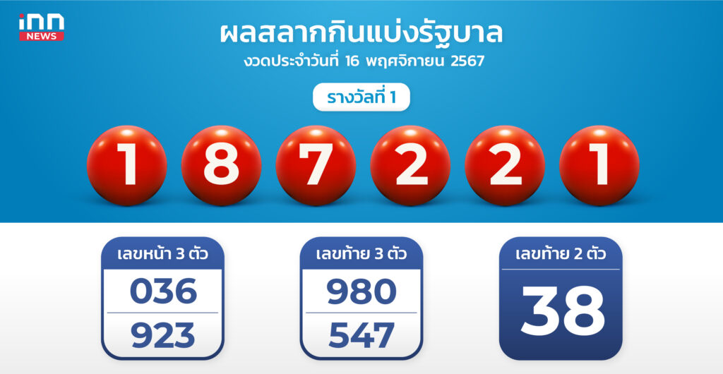 ผลสลากงวด 16 พฤศจิกายน 67 รางวัลที่ 1 คือ 187221 สองตัว 38