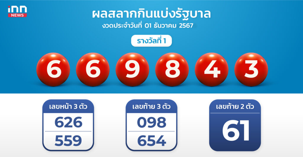 ผลสลากงวด 01 ธันวาคม 67 รางวัลที่ 1 คือ 669843 สองตัว 61