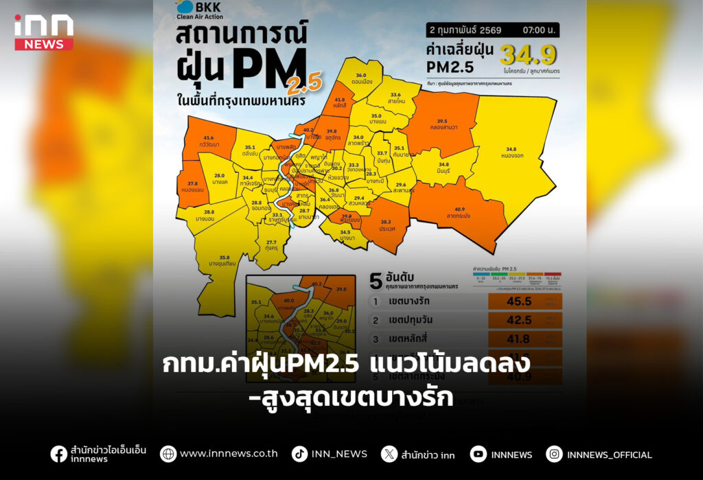 กทม.ค่าฝุ่นPM2.5 แนวโน้มลดลง สูงสุดเขตบางรัก