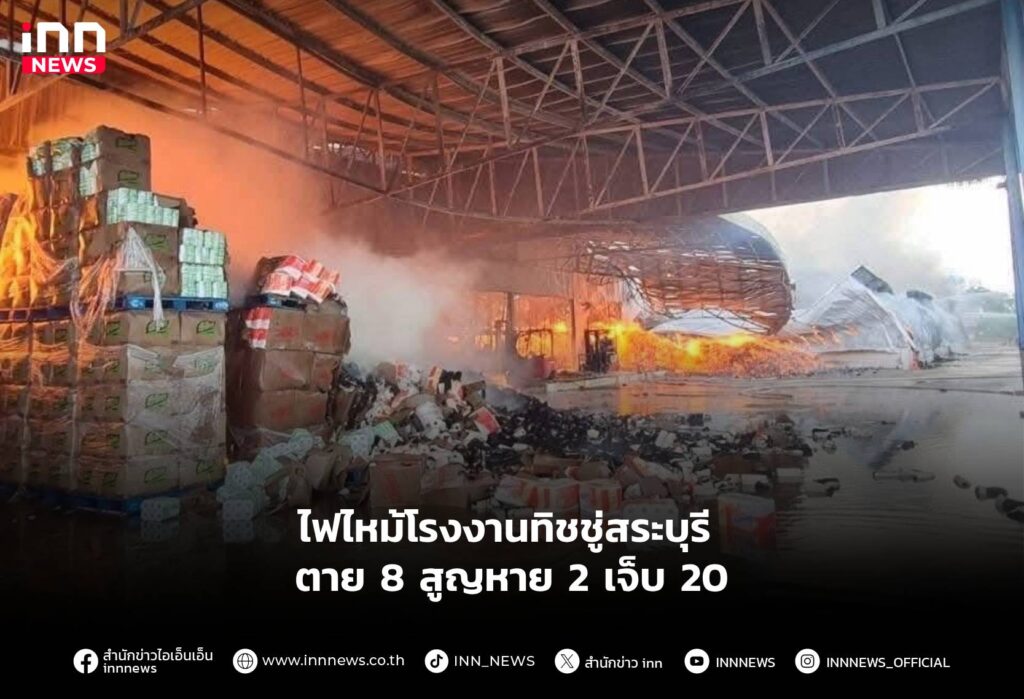 ไฟไหม้โรงงานผลิตกระดาษทิชชู สระบุรี วอดเกือบทั้งหลัง พบผู้เสียชีวิต 8 ราย สูญหาย 2 ราย บาดเจ็บกว่า 20 คน เจ้าหน้าที่เร่งหาสาเหตุ