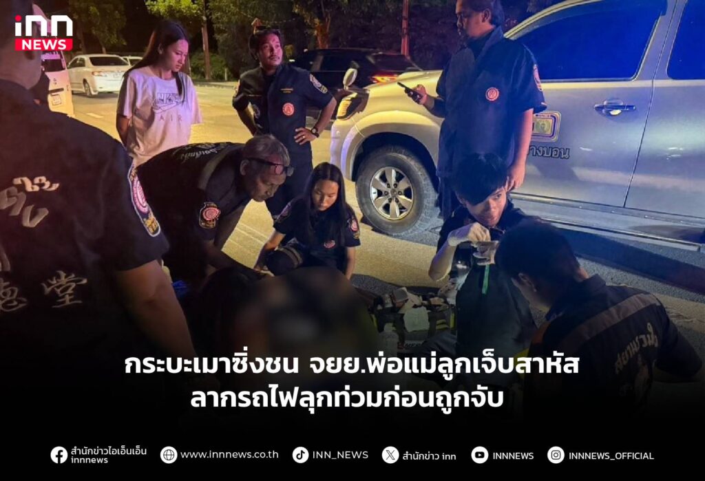 กระบะเมาซิ่งชน จยย.พ่อแม่ลูกเจ็บสาหัสลากรถไฟลุกท่วมก่อนถูกจับ