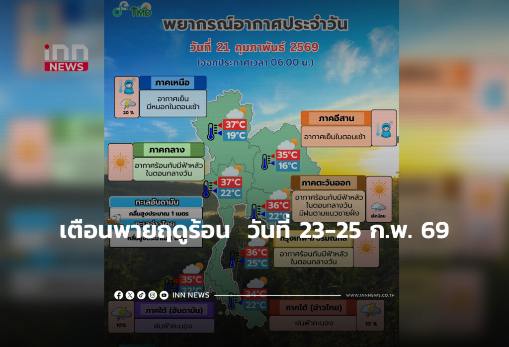 กรมอุตุฯ เตือน วันที่ 23-25 ก.พ. 69 ประเทศไทยตอนบนมีพายุฤดูร้อน มีฝนฟ้าคะนอง ลมกระโชกแรง รวมถึงลูกเห็บตกบางแห่ง