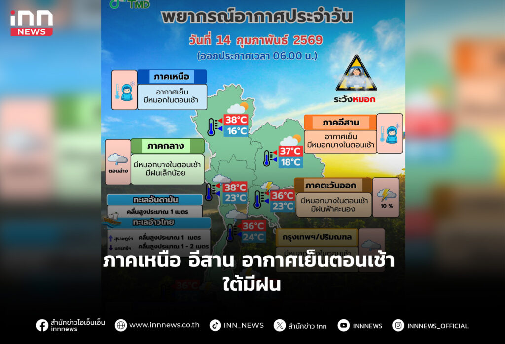 ภาคเหนือ อีสาน อากาศเย็นตอนเช้า ใต้มีฝน