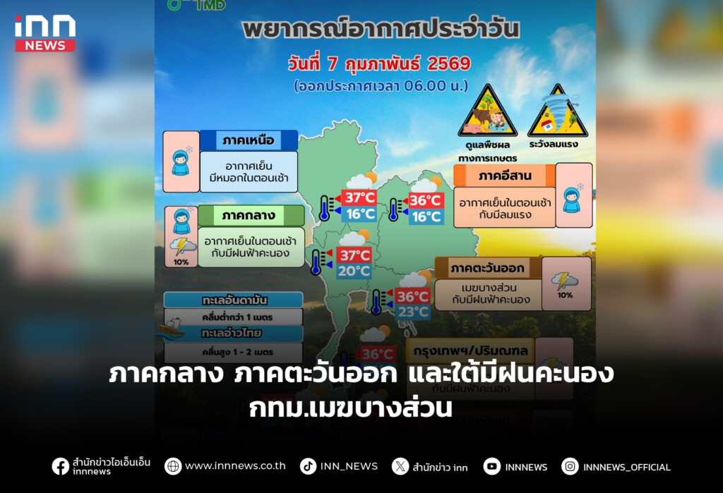 กรมอุตุฯ เผย ภาคกลาง และภาคตะวันออก และภาคใต้มีฝนฟ้าคะนองบางแห่ง ทะเลคลื่นสูง 1-2 เมตร