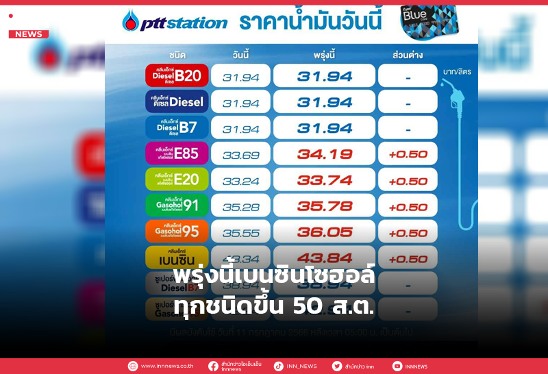 พรุ่งนี้เบนซินโซฮอล์ทุกชนิดขึ้น 50 ส.ต.