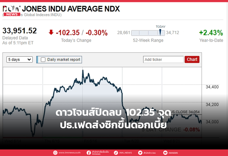 ดาวโจนส์ปิดลบ 102.35 จุด ปธ.เฟดส่งซิกขึ้นดอกเบี้ย