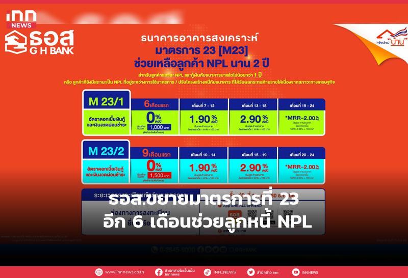 ธอส.ขยายมาตรการที่ 23 อีก 6 เดือนช่วยลูกหนี้ NPL