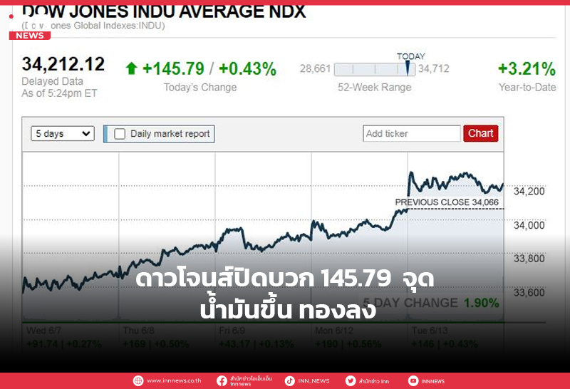 ดาวโจนส์ปิดบวก 145.79 จุด น้ำมันขึ้น ทองลง