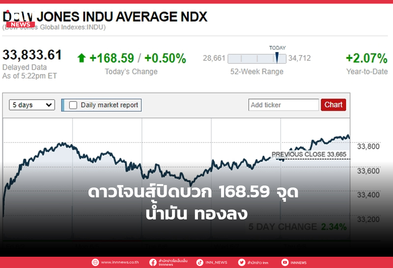 ดาวโจนส์ปิดบวก 168.59 จุด รับข้อมูลแรงงานหนุนเฟดเบรกขึ้นดอกเบี้ย ขณะน้ำมันดิบ WTI ลดลง 1.7% ทองร่วง