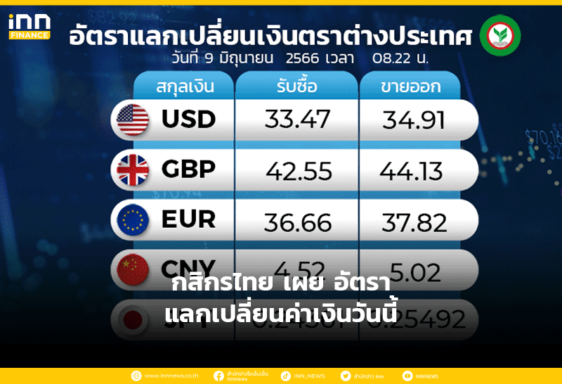 อัตราแลกเปลี่ยนเงินตราต่างประเทศ ของธนาคารกสิกรไทย เวลา 08.22 น. ดอลลาร์สหรัฐ รับซื้อ 33.47 บาท ขายออก 34.91 บาท