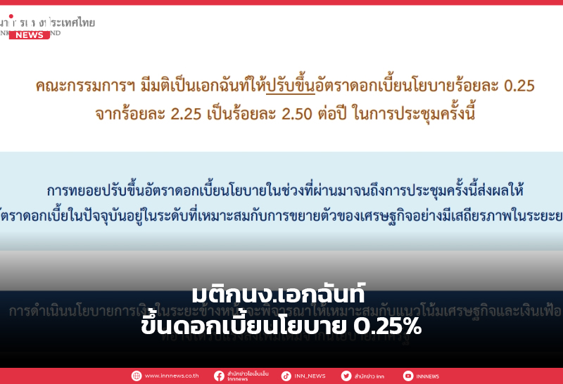 มติกนง.เอกฉันท์ ขึ้นดอกเบี้ยนโยบาย 0.25%