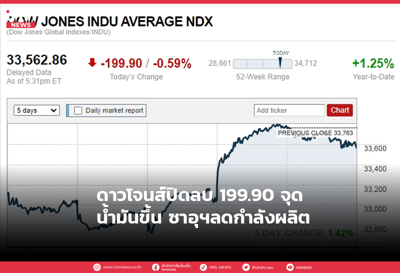 ดาวโจนส์ปิดลบ 199.90 จุด น้ำมันขึ้น ซาอุฯลดกำลังผลิต